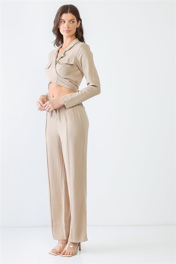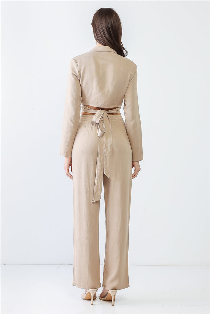 Taupe Linen Blend Collared Wrap Neck Around Self-Tie Crop Top & High Waist Pants Set