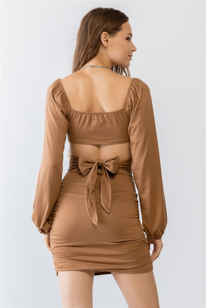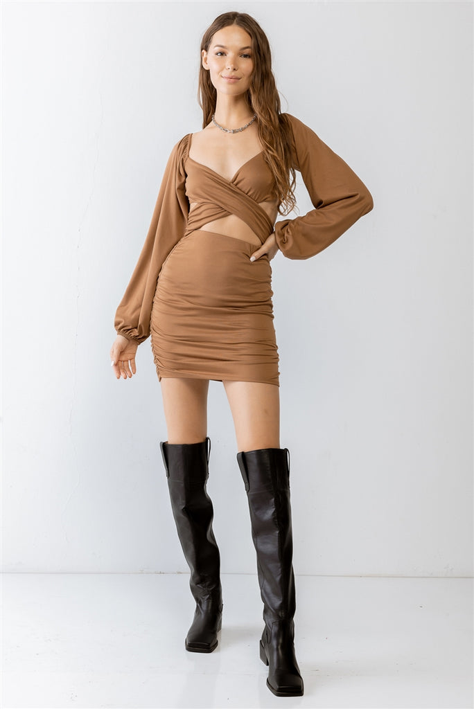 Toffee Criss-Cross Around Self-Tie Detail Cut-Out Style Wrap Neck Mini Dress